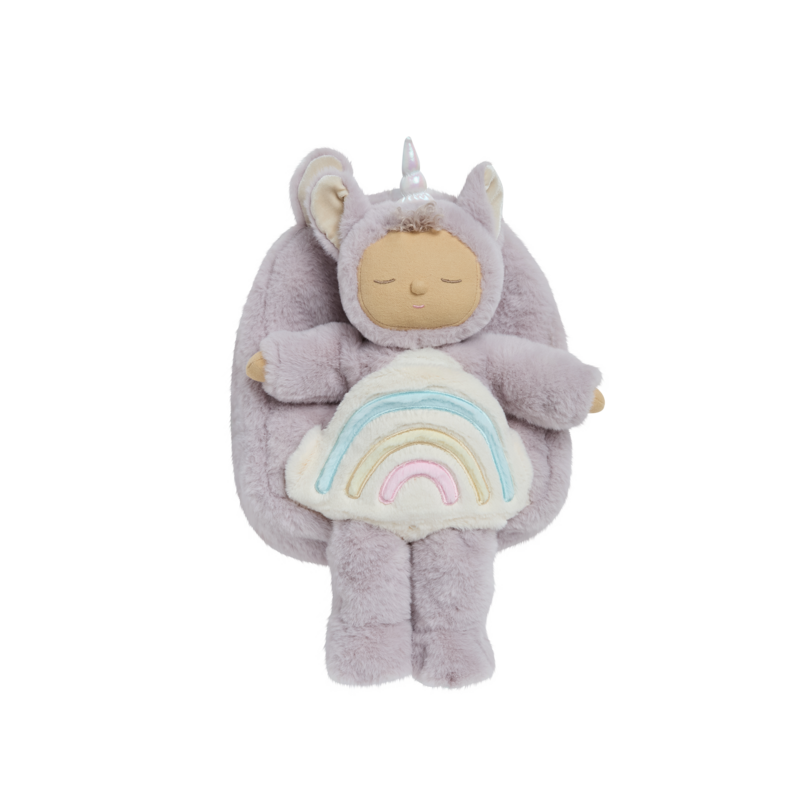 - Plush rainbow front pocket – doubles as a doll carrier with elastic loop & leg holes