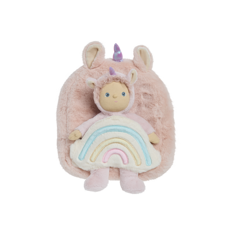 • Plush rainbow front pocket – doubles as a doll carrier with elastic loop & leg holes
