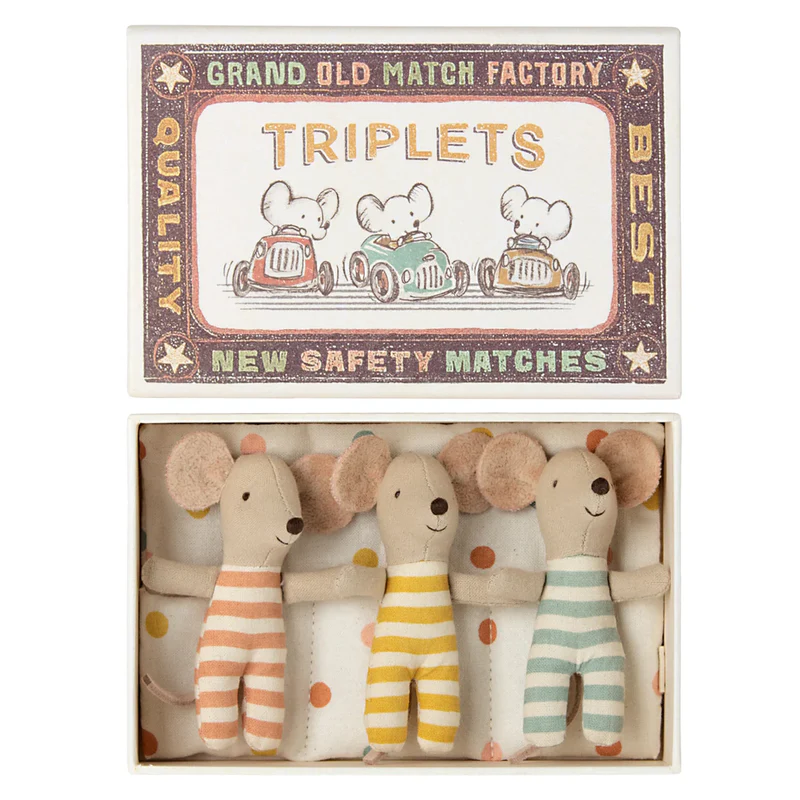 A classic Maileg item. Now you can have three baby mice at the same time. Tuck the triplet baby mice carefully in their matchbox bed in the warm sleeping bag where they sleep tight side by side.