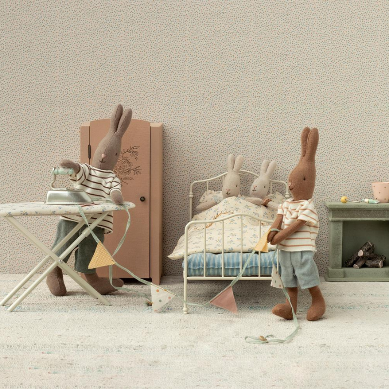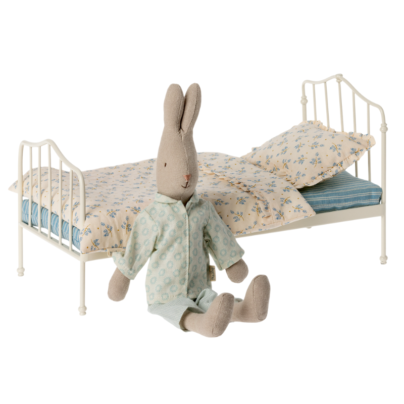 This Maileg Vintage style bed fits Maileg bunnies and rabbits in sizes 1 and 2, as well as Teddy Dad. A sweet white metal bed frame with shades of blue cotton linen and pillow in sweet Maileg printed fabrics.