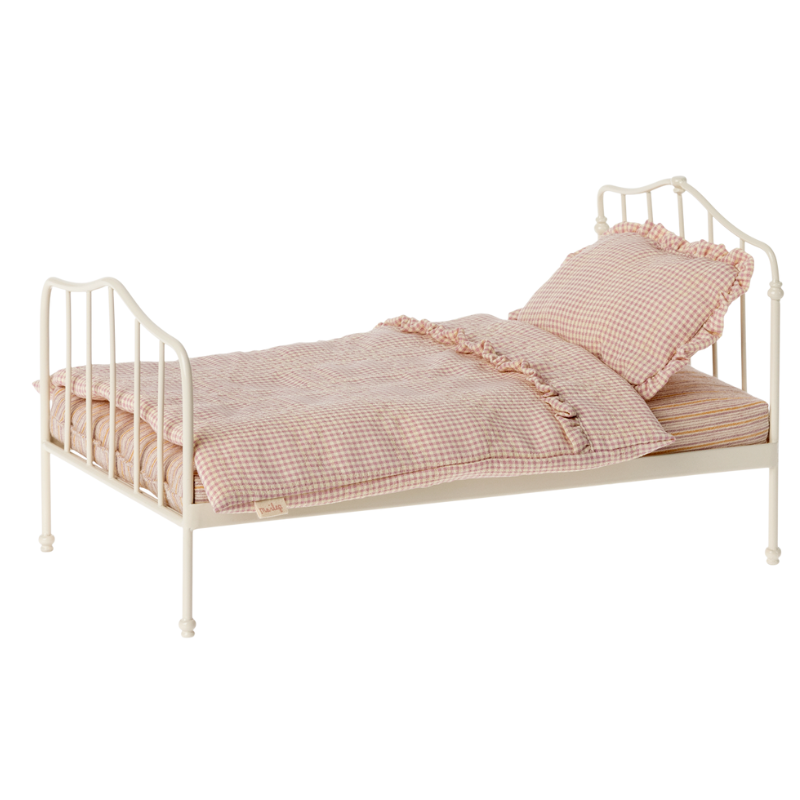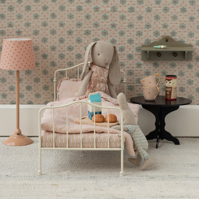 This Maileg Vintage style bed fits Maileg bunnies and rabbits in sizes 1 and 2, as well as Teddy Dad. A sweet white metal bed frame with shades of purple cotton linen and pillow in sweet Maileg printed fabrics.