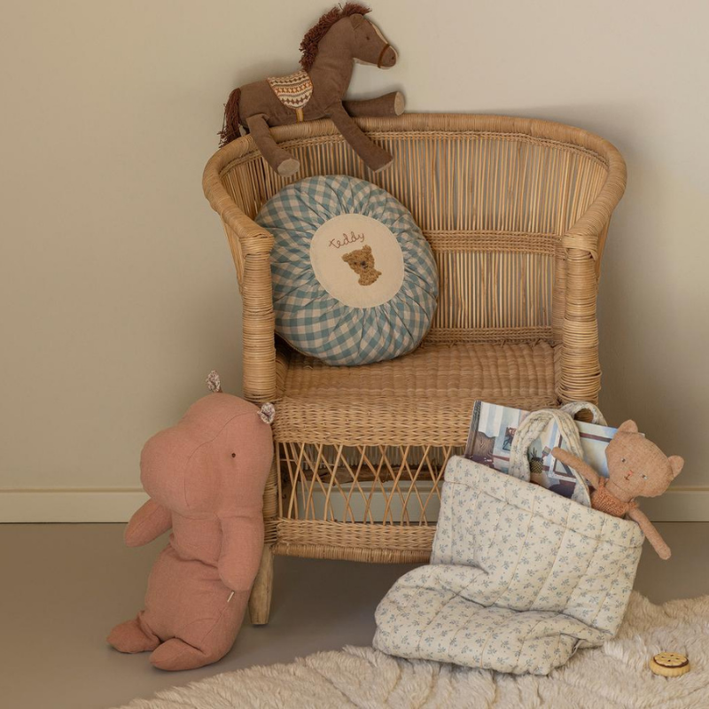 The brown pony is made in a soft cotton/linen fabric. The mane and tail is cotton strings and the saddle is made in soft knitted fabric that guarantees the ride will be comfortable.