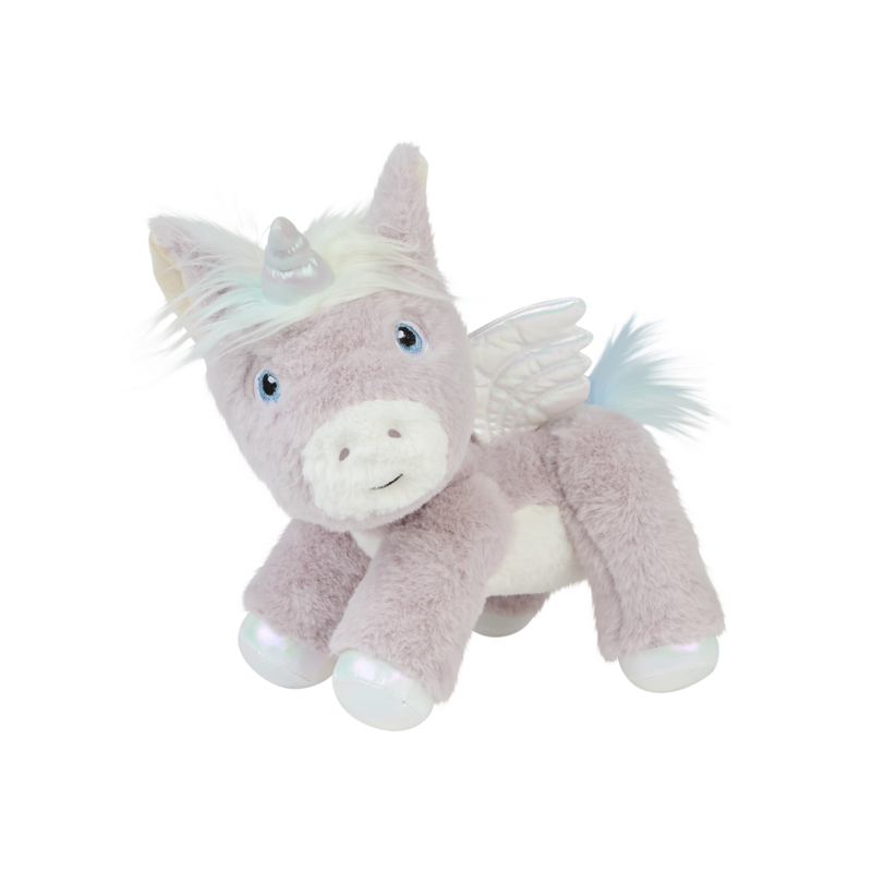 - Iridescent accent on the hooves and wings, velvet inner ears, and a plush rainbow tail and mane